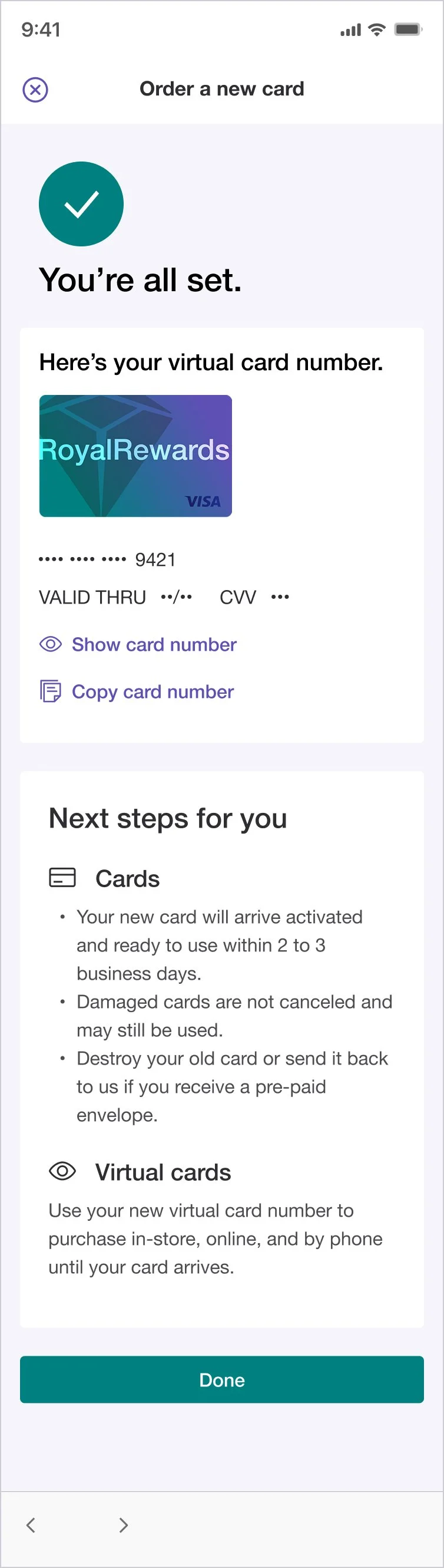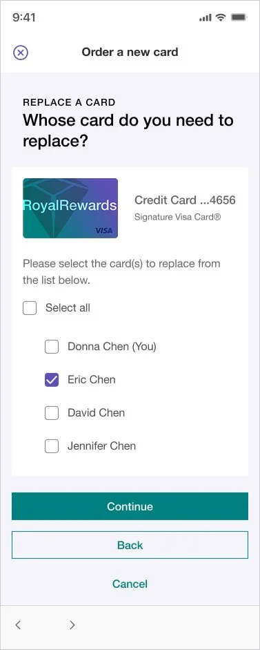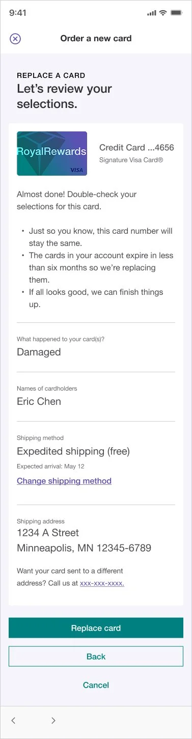 I was able to reduce the steps for card replacement by an entire page and gave users the option to opt out of replacing their own card if they wanted to replace another cardholder's card on the same account instead. This reduced unnecessary card replacement requests, saving $25 per card. Since we serve millions of customers, this represented substantial savings.